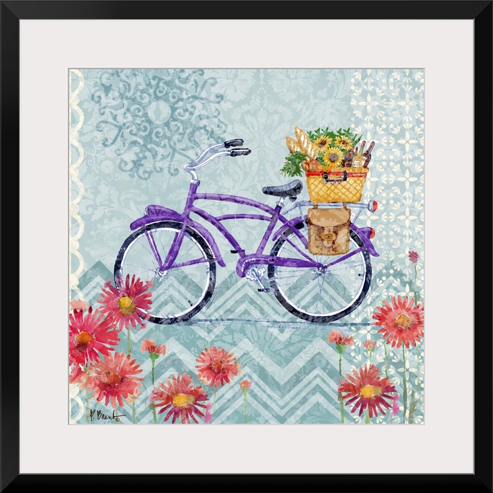 <p>Decorative panel of a vintage bicycle with a basket of flowers on a textured background and flowers on the edges.</p>