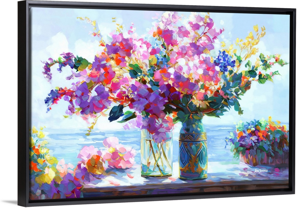 <p>In this impressionistic piece, two vases filled with an abundance of colorful flowers sit against the backdrop of a gentle sea, their lively hues and delicate forms offering a peaceful yet joyful portrayal of nature's beauty by the ocean.</p>