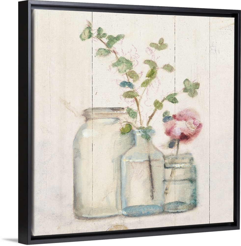 <p>Square artwork with flowers and branches in glass vases on a rustic shiplap background.</p>