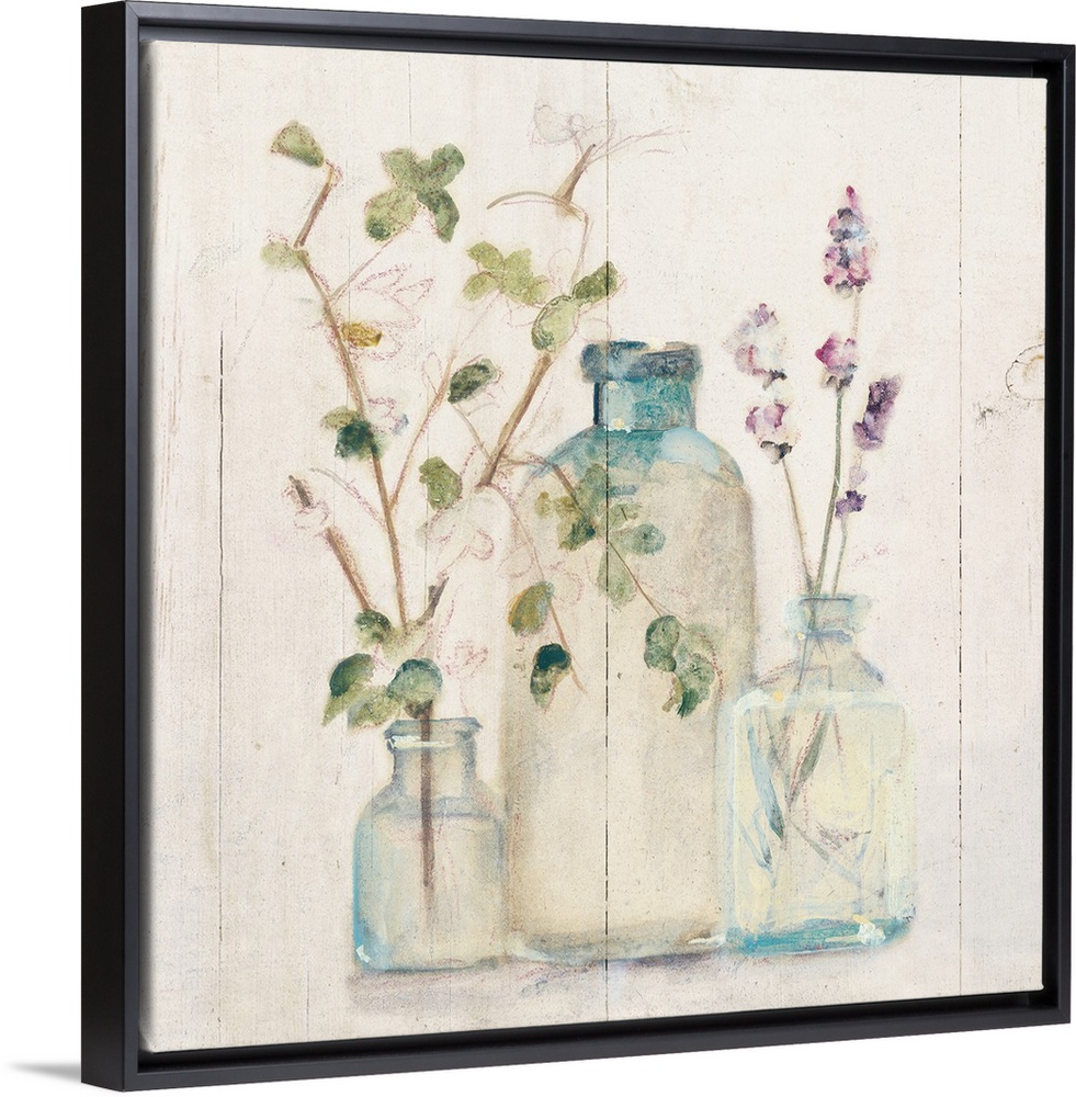 <p>Square artwork with flowers and branches in glass vases on a rustic shiplap background.</p>