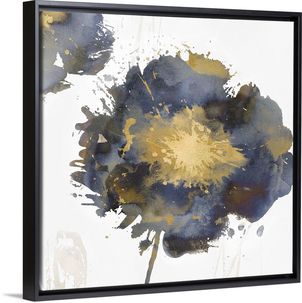 <p>Square decor with a single paint splattered flower in gold, silver, and blue hues.</p>