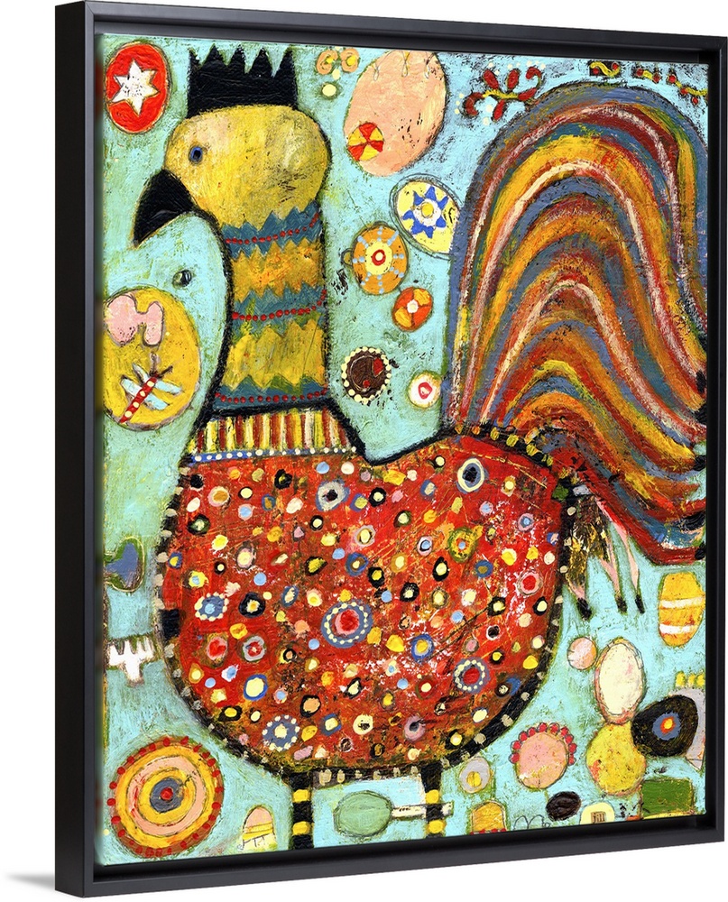 <p>Lighthearted contemporary painting of a multi-colored chicken.</p>