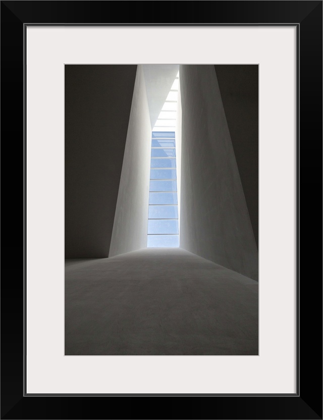 <p>Blue sky seen through a slotted window, casting an abstract shadow.</p>