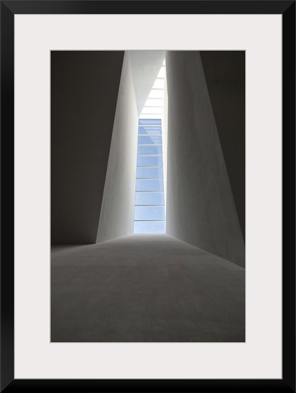 <p>Blue sky seen through a slotted window, casting an abstract shadow.</p>