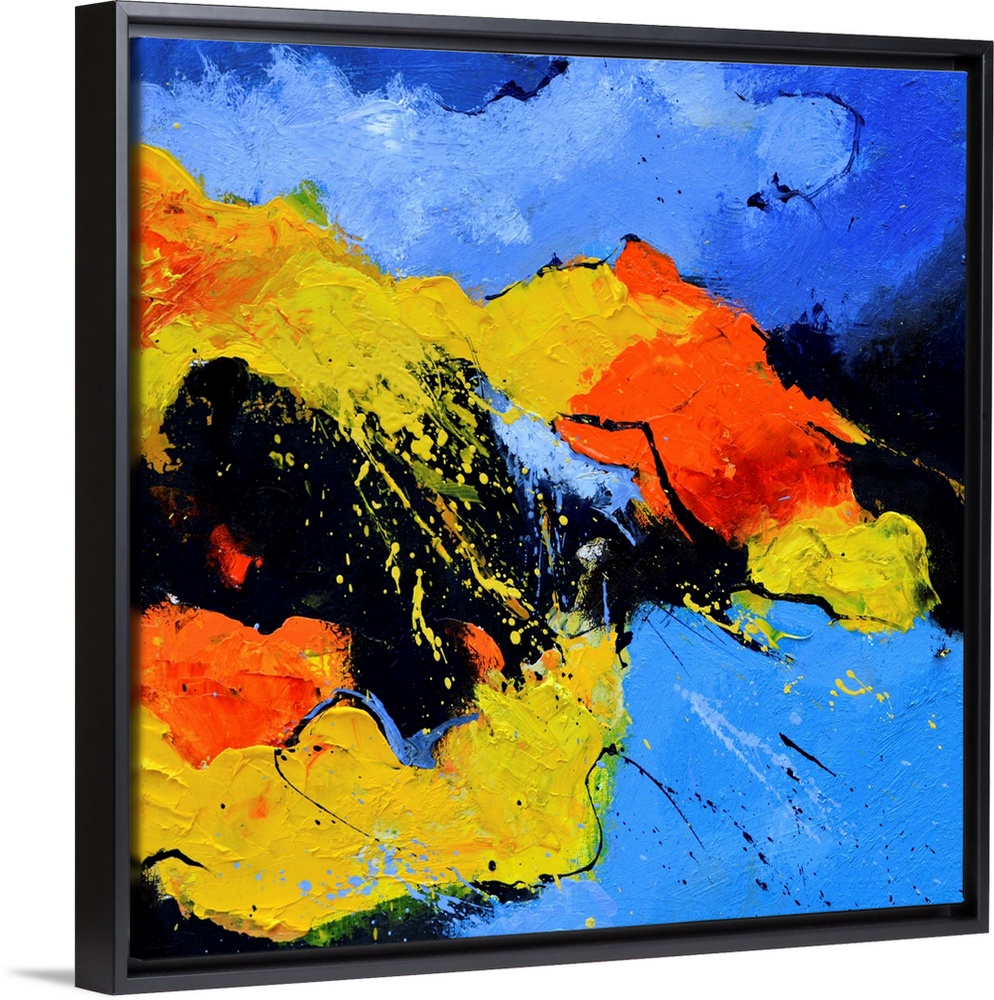 <p>A square abstract painting in vibrant shades of black, blue, orange and yellow with splatters of paint overlapping.</p>