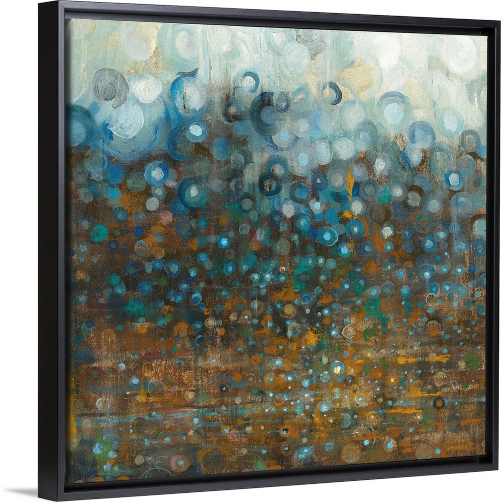 <p>Square abstract painting with a bronze background that has different shades of blue circles falling from the top.</p>