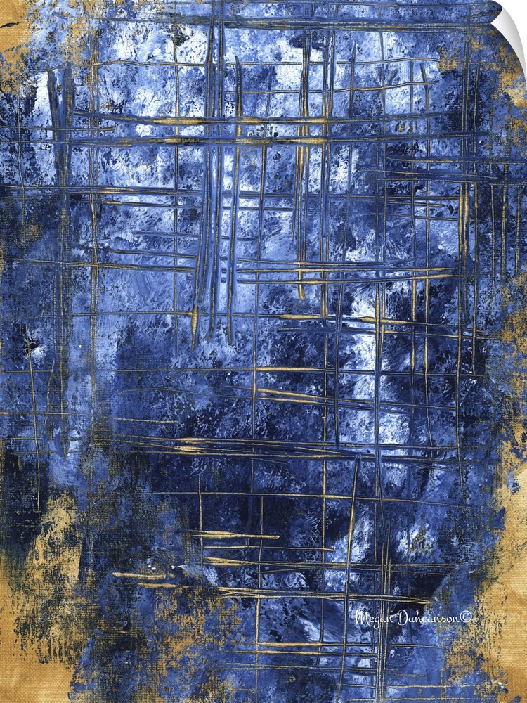 <p>A contemporary abstract painting that has a gold background and different shades of dark blue on top. There are lines going horizontally and vertically through the blue hues making the gold standout to create texture.</p>