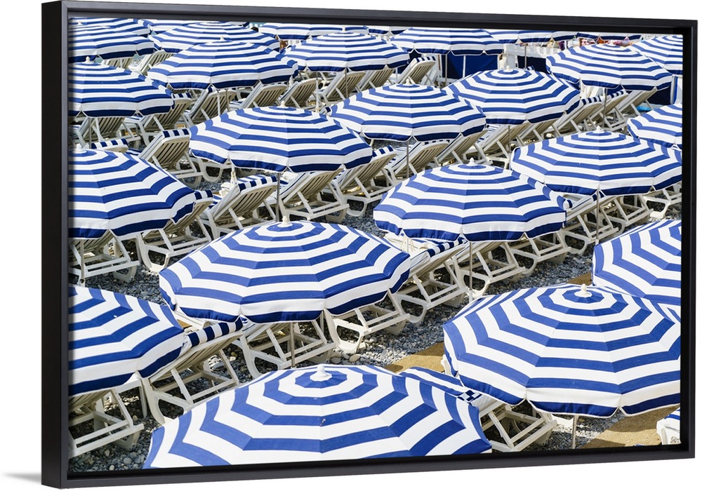 <p>Blue and white beach parasols, Nice, Alpes Maritimes, Cote d'Azur, Provence, France</p>
