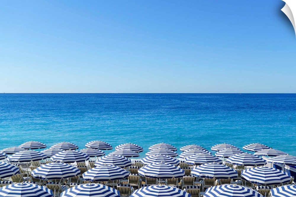 <p>Blue and white beach parasols, Nice, Cote d'Azur, Alpes-Maritimes, Provence, French Riviera, France, Mediterranean, Europe</p>