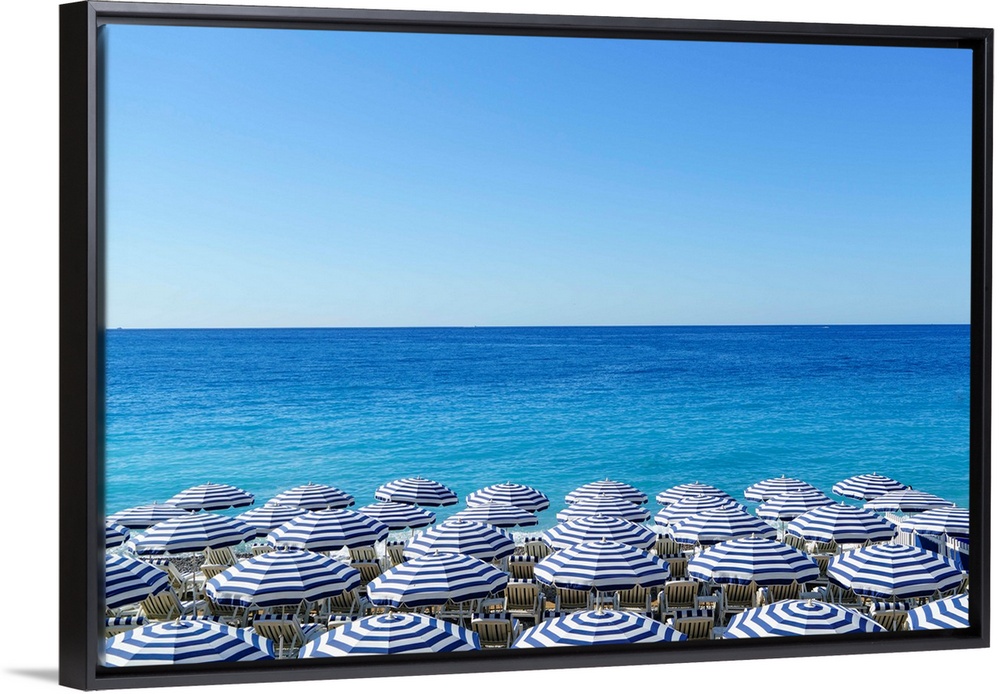 <p>Blue and white beach parasols, Nice, Cote d'Azur, Alpes-Maritimes, Provence, French Riviera, France, Mediterranean, Europe</p>