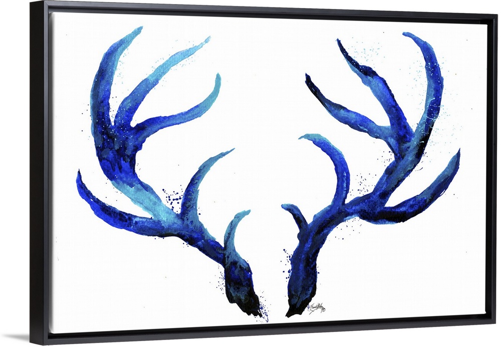 <p>Watercolor painting of a set of blue antlers with light paint splatter around on a white background.</p>