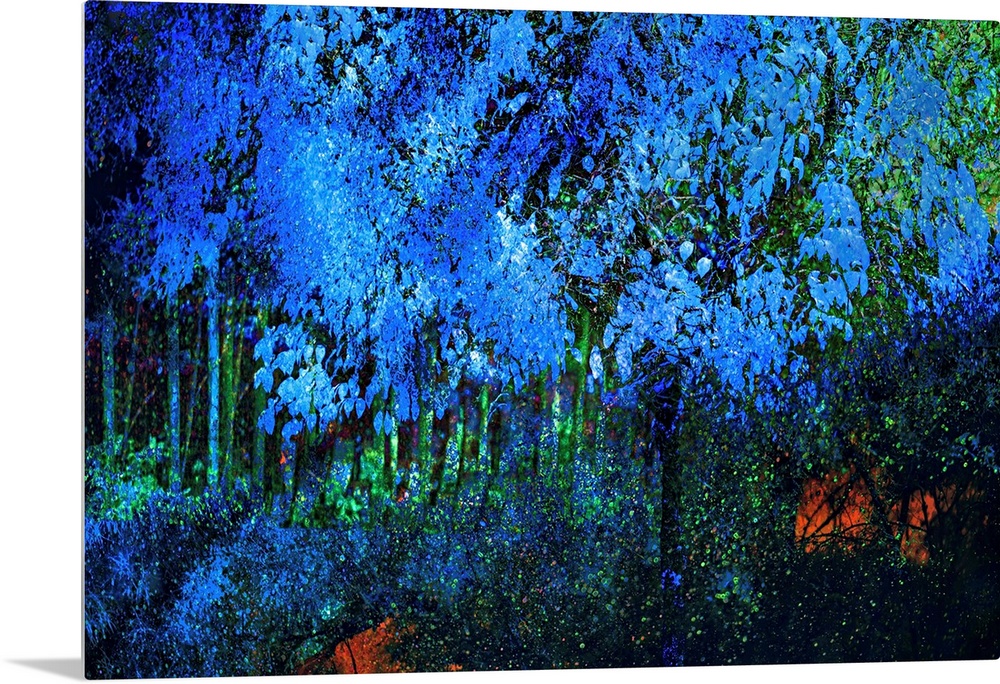 <p>Multiple exposure of a group of very tall, stately trees. I used a macro lens on a digital camera, multi set to darken mode. The colors were enhanced and changed in post-processing. It intends to give the impression of camping deep in the woods. Ursula Abresch Abstract Trees Collection.</p>