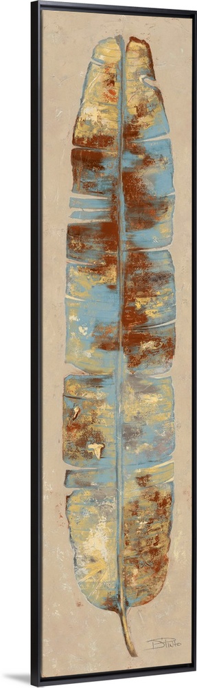 <p>Contemporary artwork of a long, broad leaf in blue and brown shades.</p>