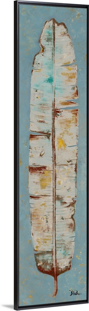 <p>Contemporary artwork of a long, broad leaf in blue and brown shades.</p>