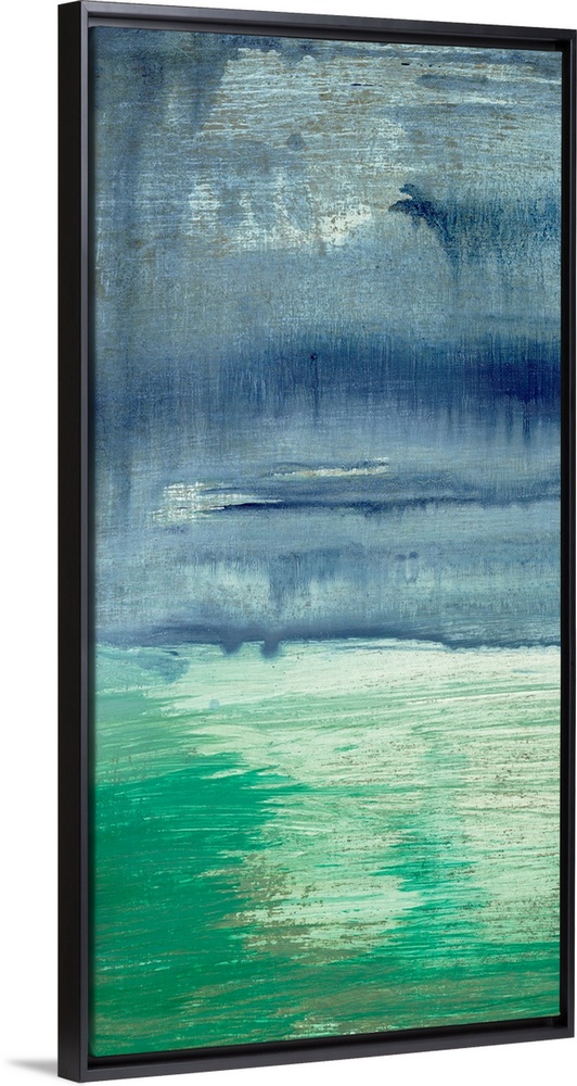 <p>An abstracted painting of a waterscape with cool, blue tones.</p>