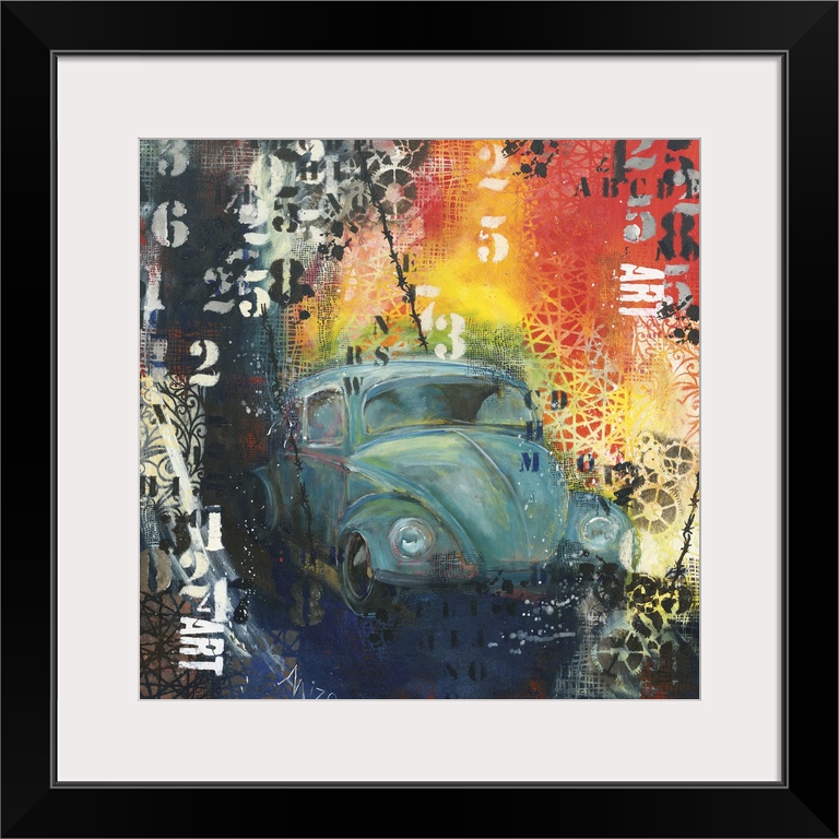 <p>Painting of a blue Volkswagen beetle embellished with paint splatters and stenciled numbers.</p>