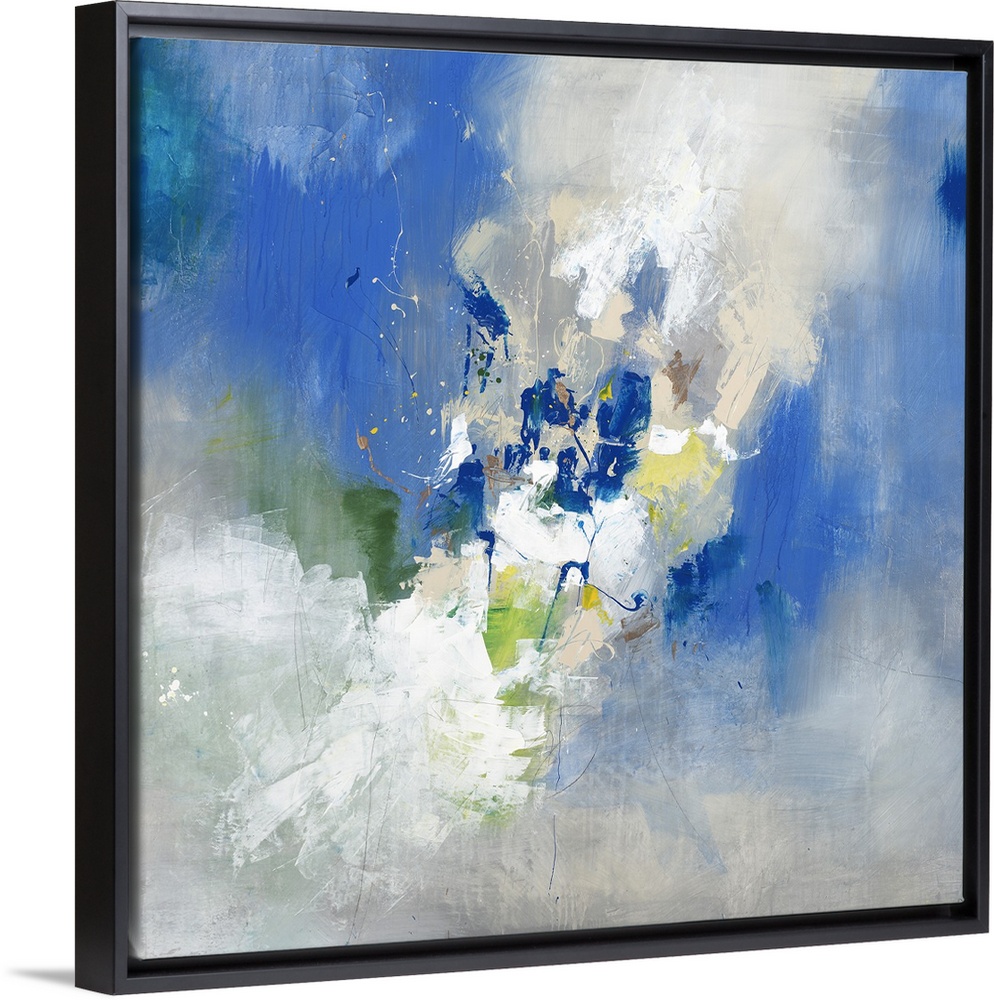 <p>Square abstract painting with bright blue, white, and gray hues broadly spread out in the background and a cluster of blue, yellow, white, green, and tan hues coming together in the middle.</p>