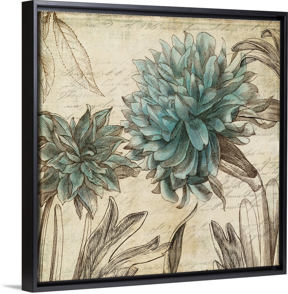 <p>Contemporary home decor art of blue flowers against a weathered vintage background.</p>