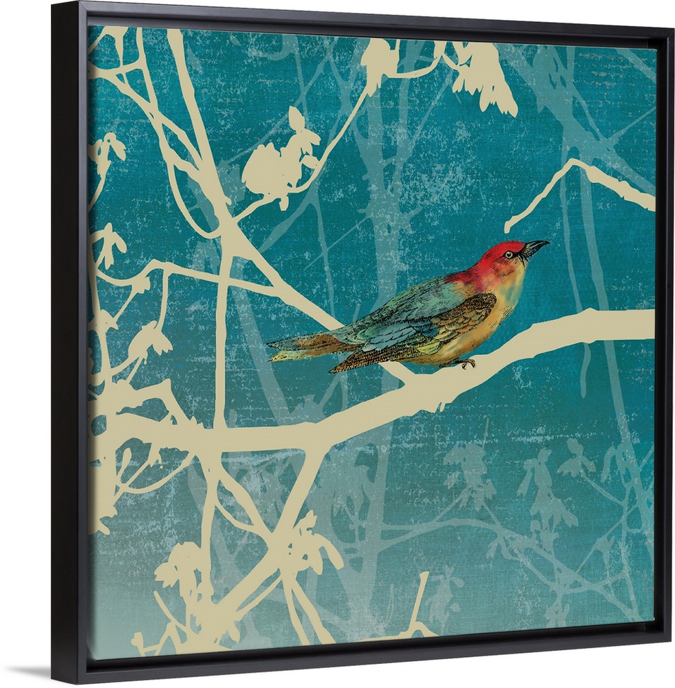 <p>Contemporary home decor art of a bird perched on a silhouetted branch against a faded blue background.</p>