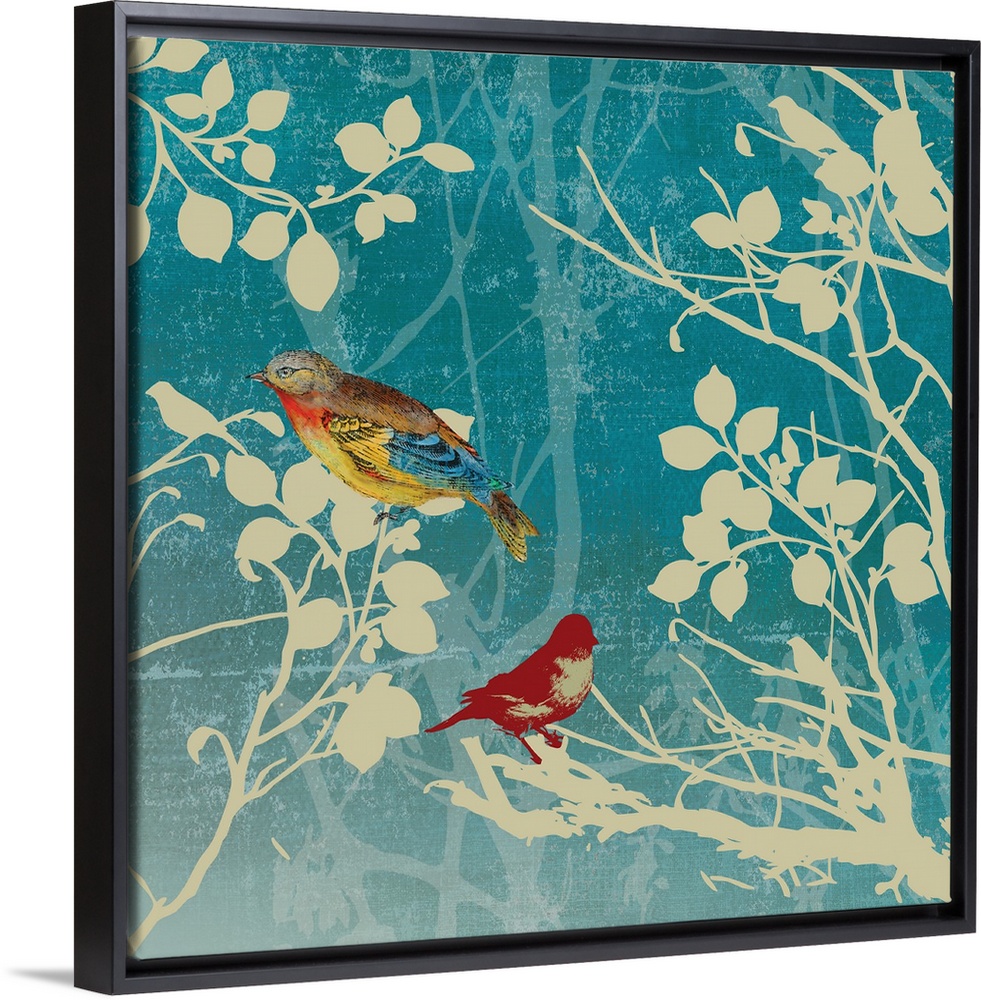 <p>Contemporary home decor art of two birds perched on a silhouetted branch against a faded blue background.</p>