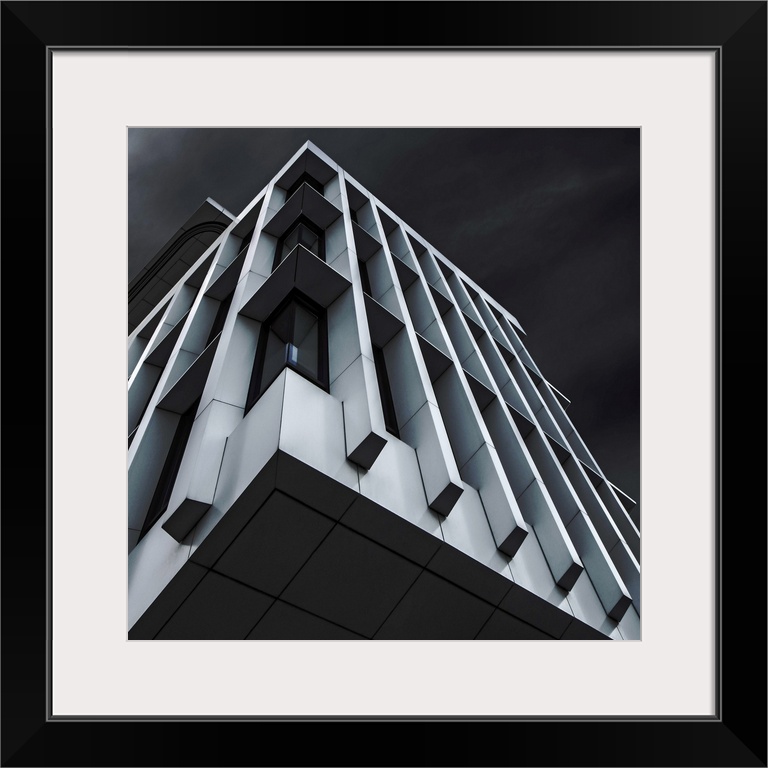 <p>Square abstract black and white photograph with a blue tint looking up at a modern building.</p>