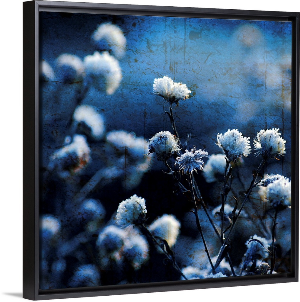 <p>A fine art photograph of flower blossoms that have been given a cool hued tint and a distress texture overlaid on the photograph. This square shaped decorative artwork will make a dramatic statement at larger sizes.</p>