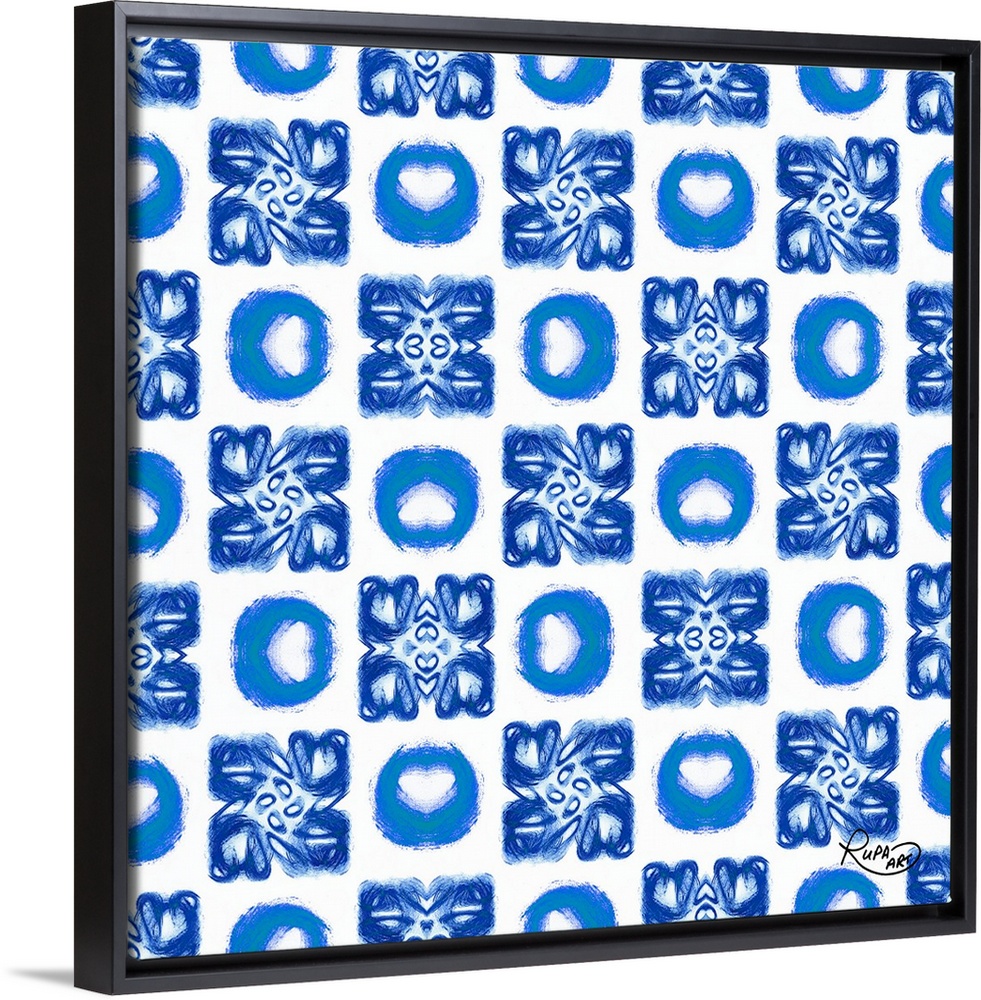 <p>Square artwork with a repetitive pattern of brush stroked circles in blue and white.</p>