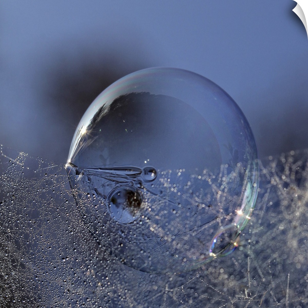 <p>A large soap bubble sits under a web of small dew drops.</p>