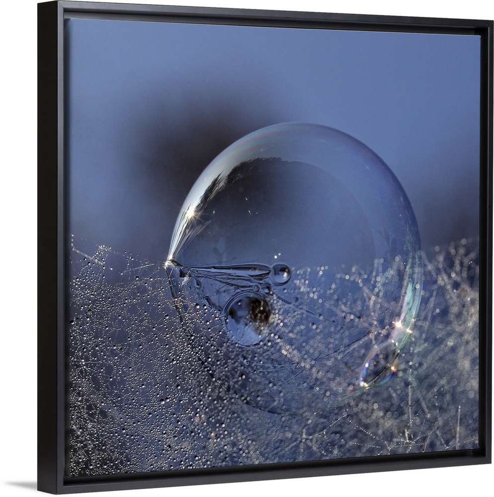 <p>A large soap bubble sits under a web of small dew drops.</p>