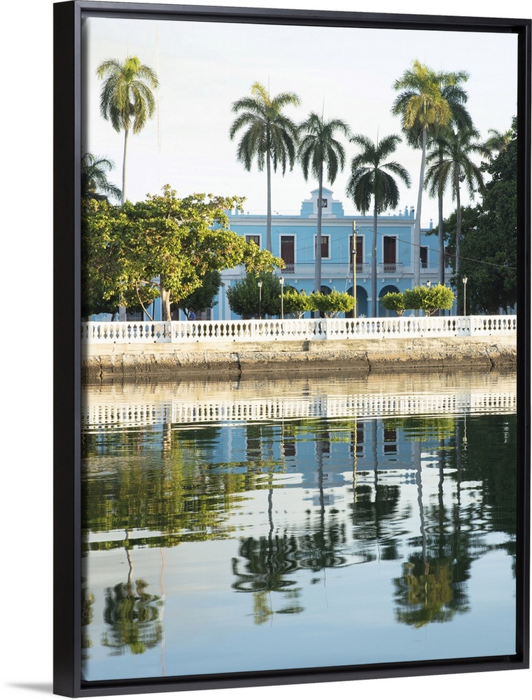 <p>Blue building and reflection on water, Cienfuegos, Cienfuegos Province, Cuba.</p>