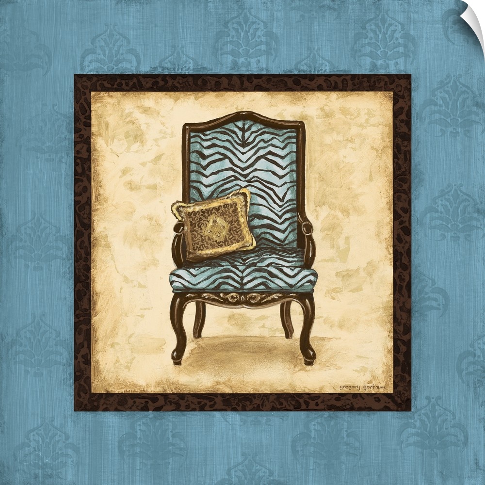 <p>Square painting with a blue and brown zebra striped chair in the center with a tan background and dark brown decorative boarder on a blue background with faint designs.</p>