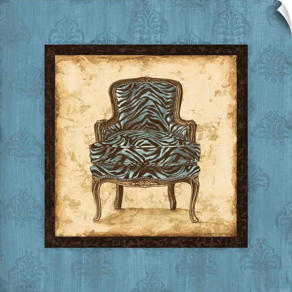 <p>Square painting with a blue and brown zebra striped chair in the center with a tan background and dark brown decorative boarder on a blue background with faint designs.</p>