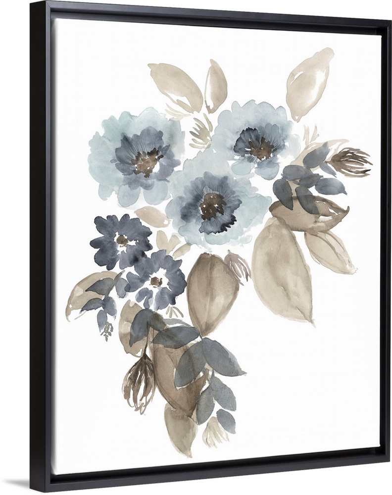 <p>A simple, loose watercolor floral image in complimentary shades of pale, inky blue and warm taupe.</p>