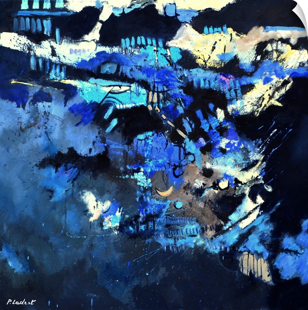 <p>Square abstract painting made in shades of blue, yellow, tan, and white with a small hint of pink representing a city.</p>