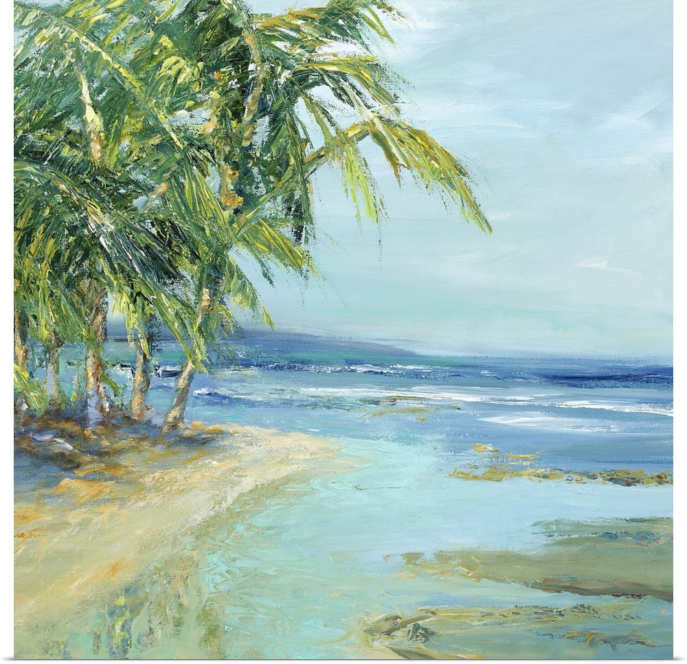 <p>Contemporary artwork featuring lively brush strokes to create a relaxing beach scene.</p>