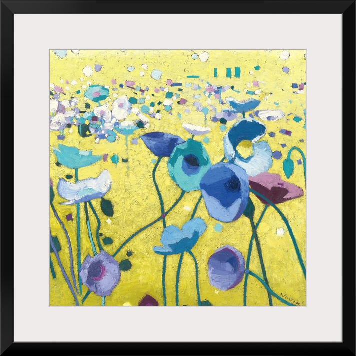 <p>Contemporary artwork of a field of blue poppies with long stems.</p>
