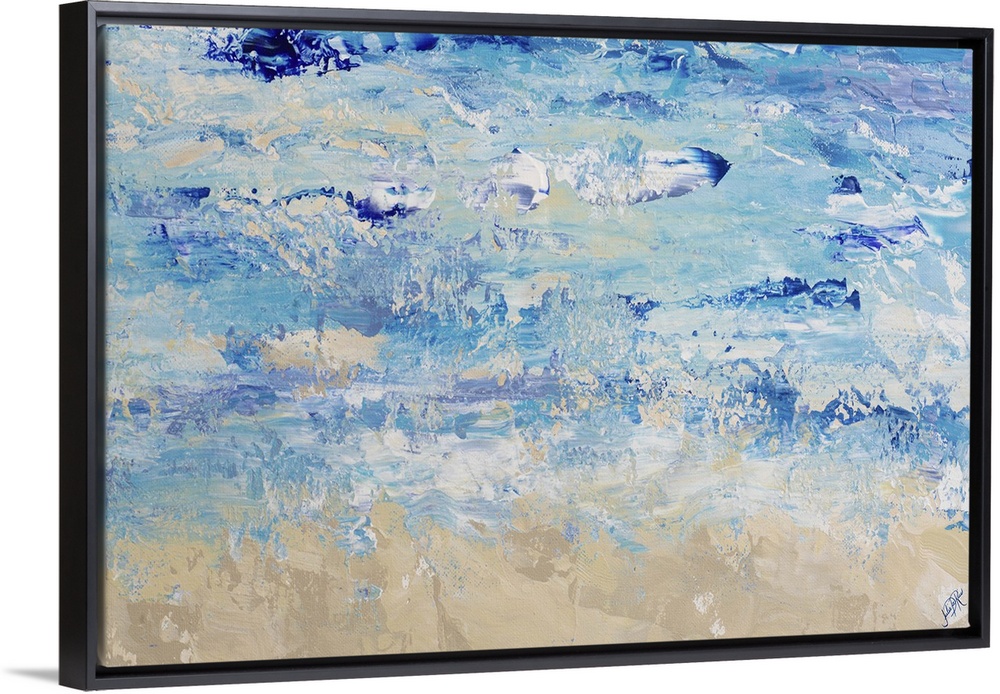 <p>A contemporary abstract painting with various blue hues with added white and tan hues to resemble ocean waves crashing on shore.</p>
