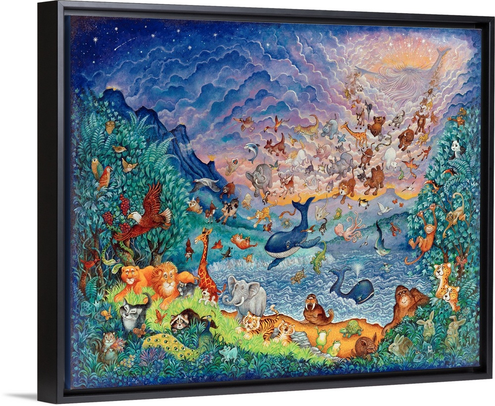 <p>Creation of animals falling from the sky, in blue.</p>