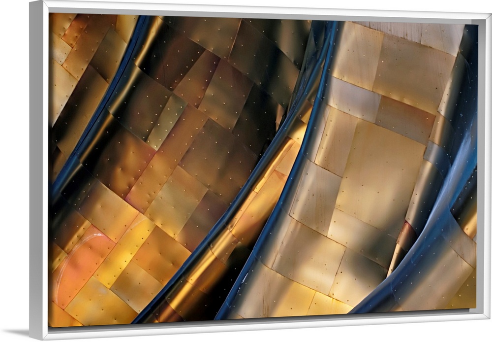 <p>Abstract photograph of a large metal structure reflecting blue and gold light.</p>