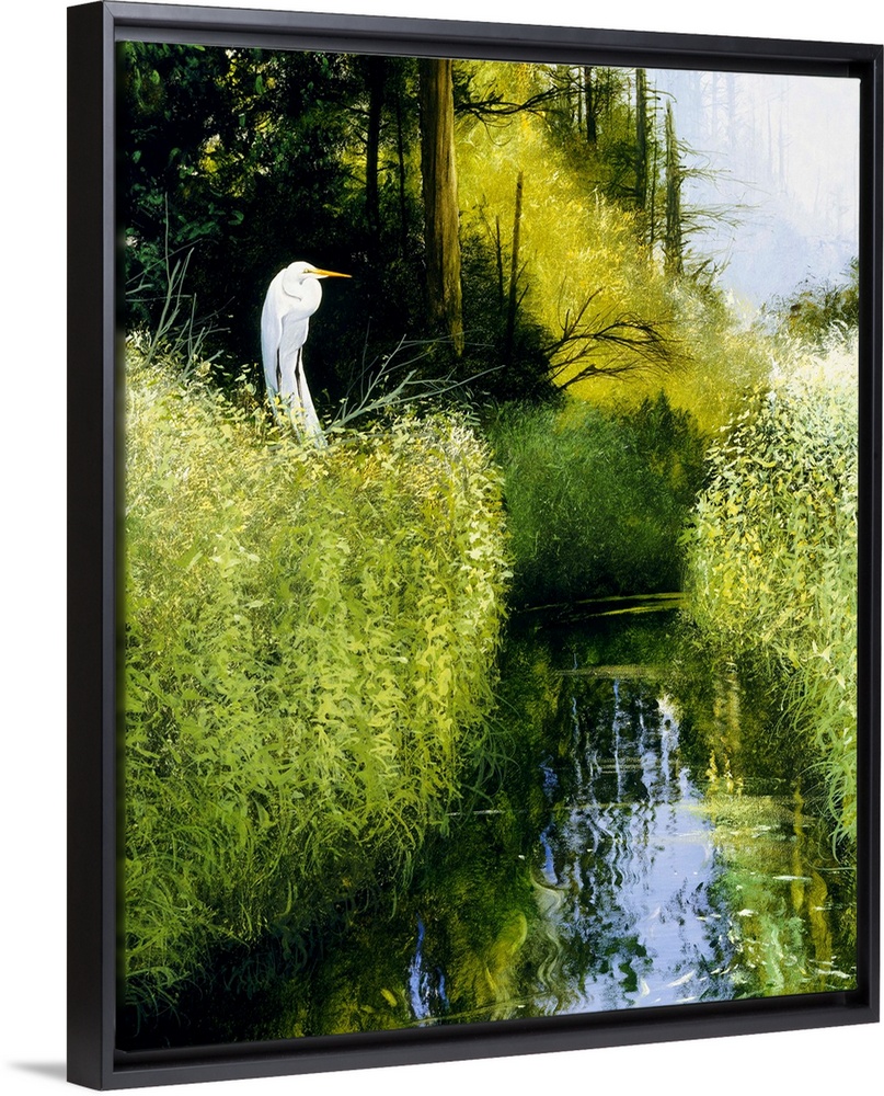 <p>Contemporary painting of an egret perched on a branch above a river flowing through a wetland.</p>