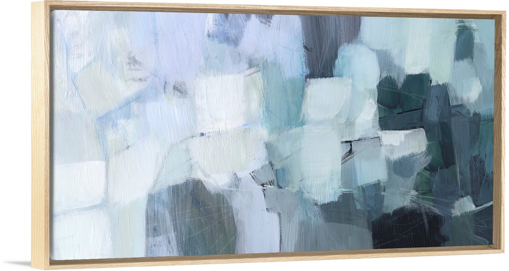 <p>A blocky, horizontal abstract image in seaglass shades of aqua, pale grey, light blue and dark teal. It would sit perfectly in a contemporary or midcentury setting, over a sofa, fireplace or in the dining room.</p>