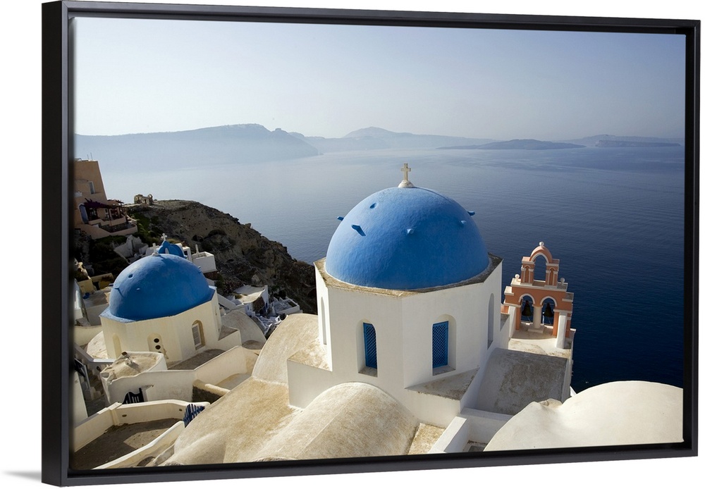 <p>Photograph taken on the coast of Greece looking out toward the water with blue domed churches sitting in the cliffs.</p>