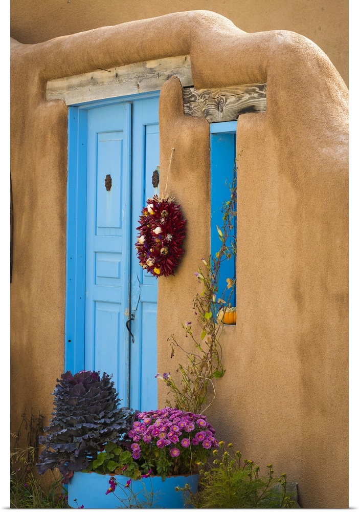 <p>Photograph of a bright blue door and wreath in an adobe wall.</p>