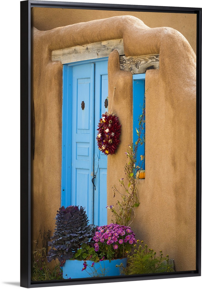 <p>Photograph of a bright blue door and wreath in an adobe wall.</p>