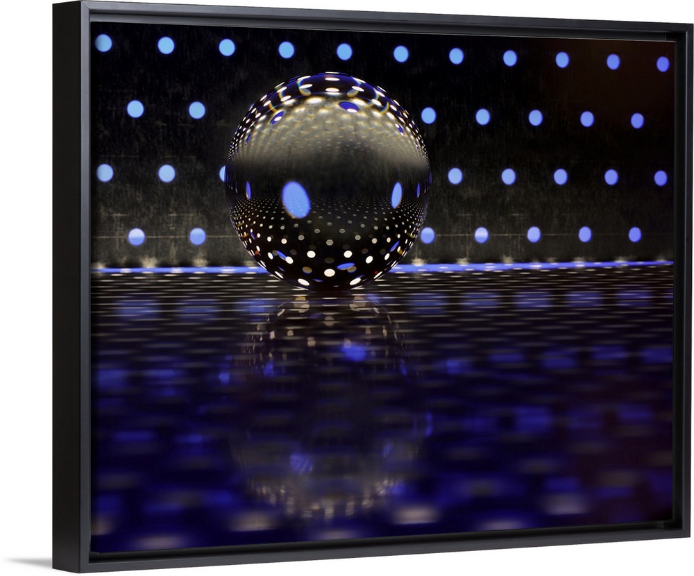 <p>A glass ball on a metal plate with blue dots of color reflecting.</p>