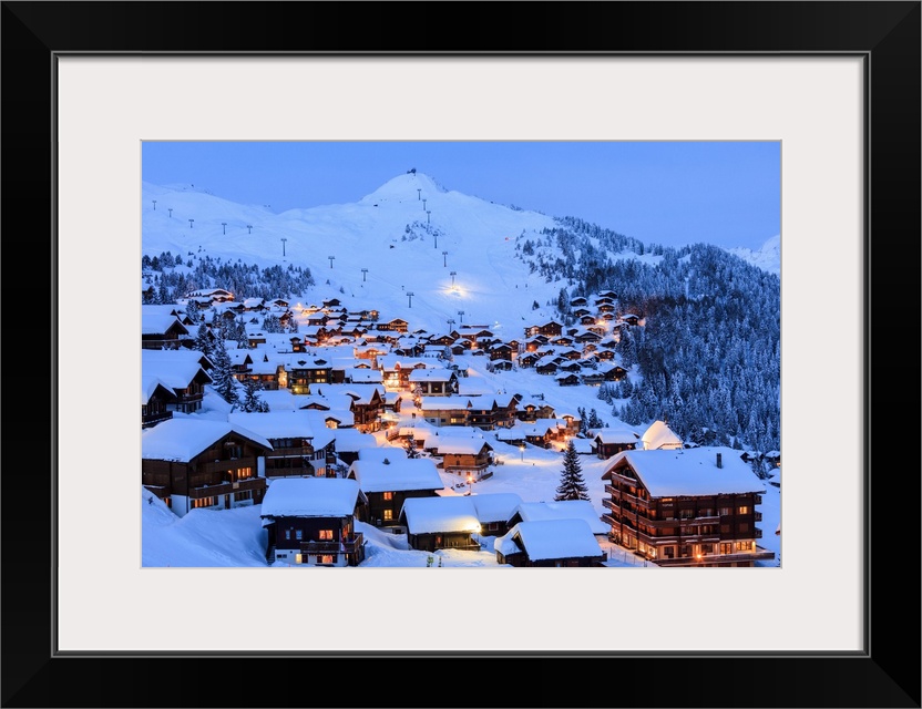 <p>Blue dusk on the snowy alpine village surrounded by ski lifts, Bettmeralp, district of Raron, canton of Valais, Switzerland, Europe</p>
