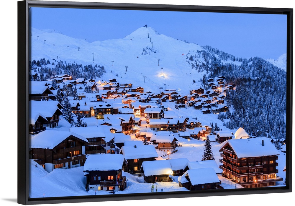 <p>Blue dusk on the snowy alpine village surrounded by ski lifts, Bettmeralp, district of Raron, canton of Valais, Switzerland, Europe</p>