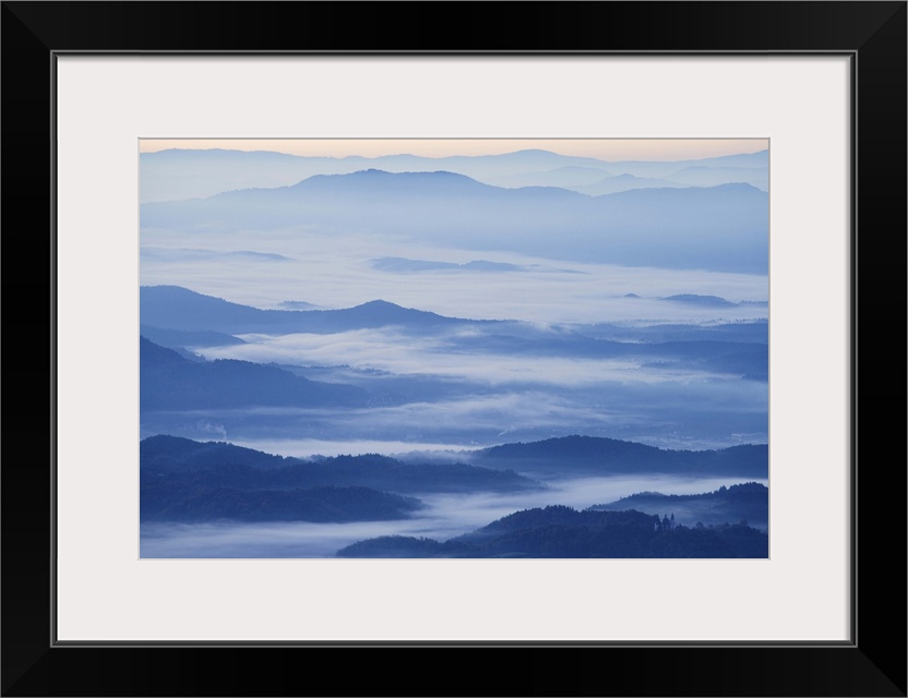 <p>View of Ljubljana Basin towards the Kamnik Alps with morning mist, Gorenjska, Slovenia.</p>