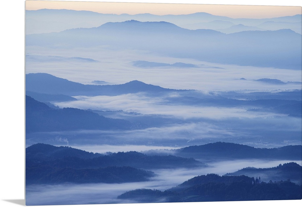 <p>View of Ljubljana Basin towards the Kamnik Alps with morning mist, Gorenjska, Slovenia.</p>