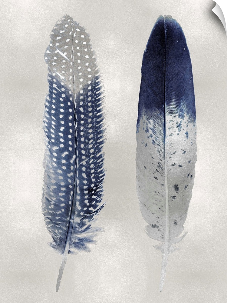 <p>Illustration of two blue feathers with metallic silver on a shiny silver background.</p>